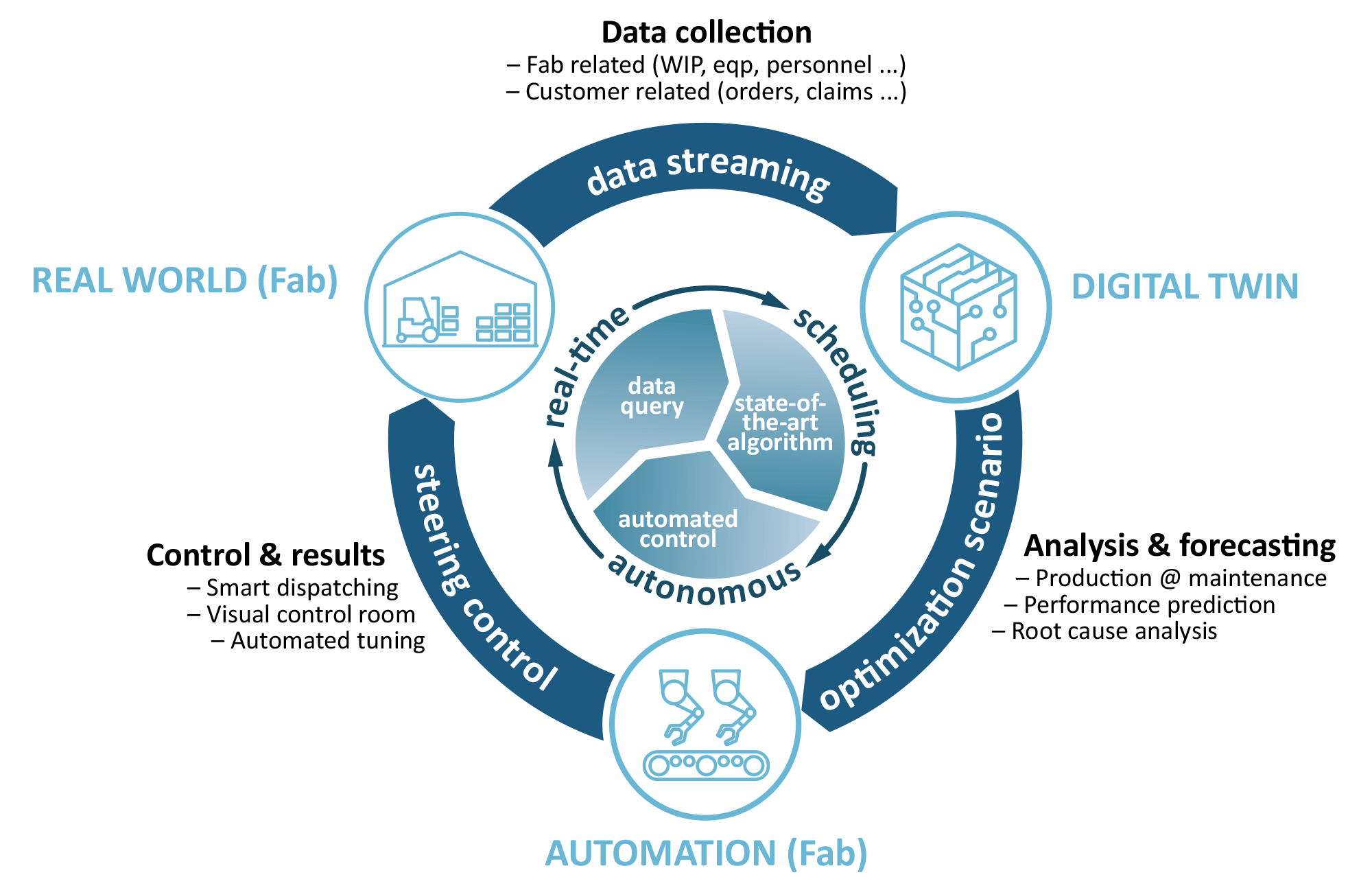 This new level of interaction will be realized as a semantically and physically inspired system of holistic information processing, which will support and enable a new degree of real-time capability and information consistency during the manufacturing process, and a highly efficient ‘plug-in-capability’ for innovative new AI methods to be deployed.